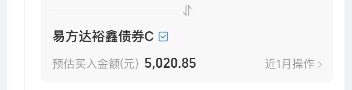 $易方达裕鑫债券C$ +5K,股市上周虽然有所调整,但是成交量来看的话,上涨的趋势还是没有结束的,不过板块太多了,哪怕行情好普涨,也不一定都能吃上肉,不喜欢波动太大的话,我觉得固收+还是蛮香的。今天继续补一笔易方达裕鑫债券C,它属于弹性比较大的固收+,48.25%的可转债+18.22%的权益增强,同时还有51.81%的纯债稳健打底,股市震荡的时候可以做到一定对冲,行情好的时候又可以跟得上涨幅。近一月收蛋563个,近一年收益率22.30%,各维度业绩都跑赢了同策略基金,债市收益偏低,股基回撤又大,固收+属于两者中间,性价比还是不错的,我再补点仓位。