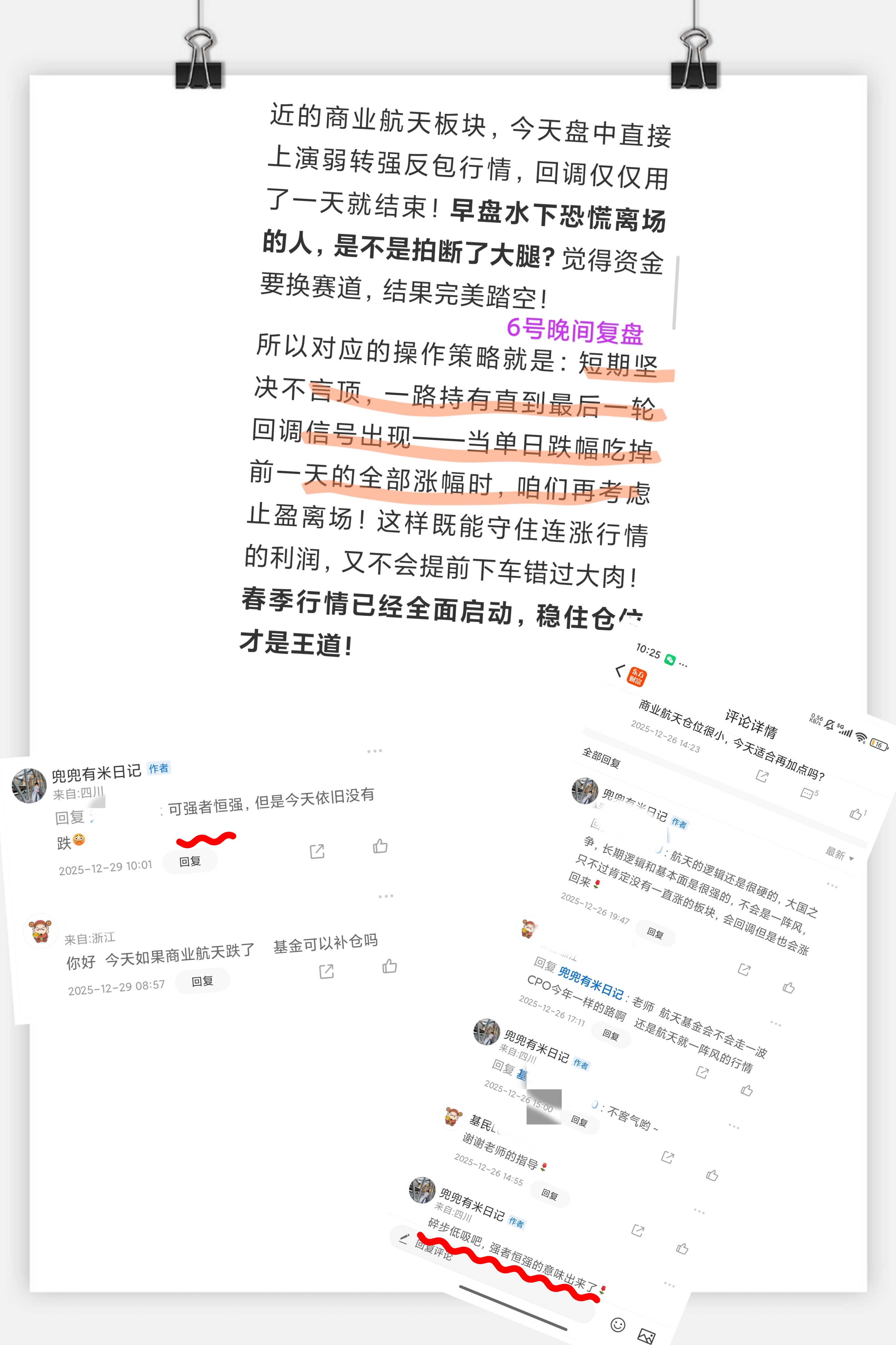 指数预判咱天天拿捏,板块方面更是杀疯了!本周二兜兜就说:指数和商业航天,短期坚决不言顶!持有到单日跌幅吃掉前一天全部涨幅,再考虑止盈!这波操作,既守住了利润,又没提前下车错过大肉!春季行情全面启动,稳住仓位就是王道,这话谁听谁赚!