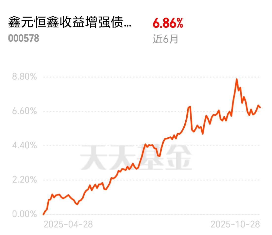 最近央妈重启国债买卖,债市挺活跃的,利率中枢有下移趋势。想稳稳赚点收益的话,鑫元恒鑫收益增强债券A不错,近6个月业绩有6.86%,低风险里算能打的。