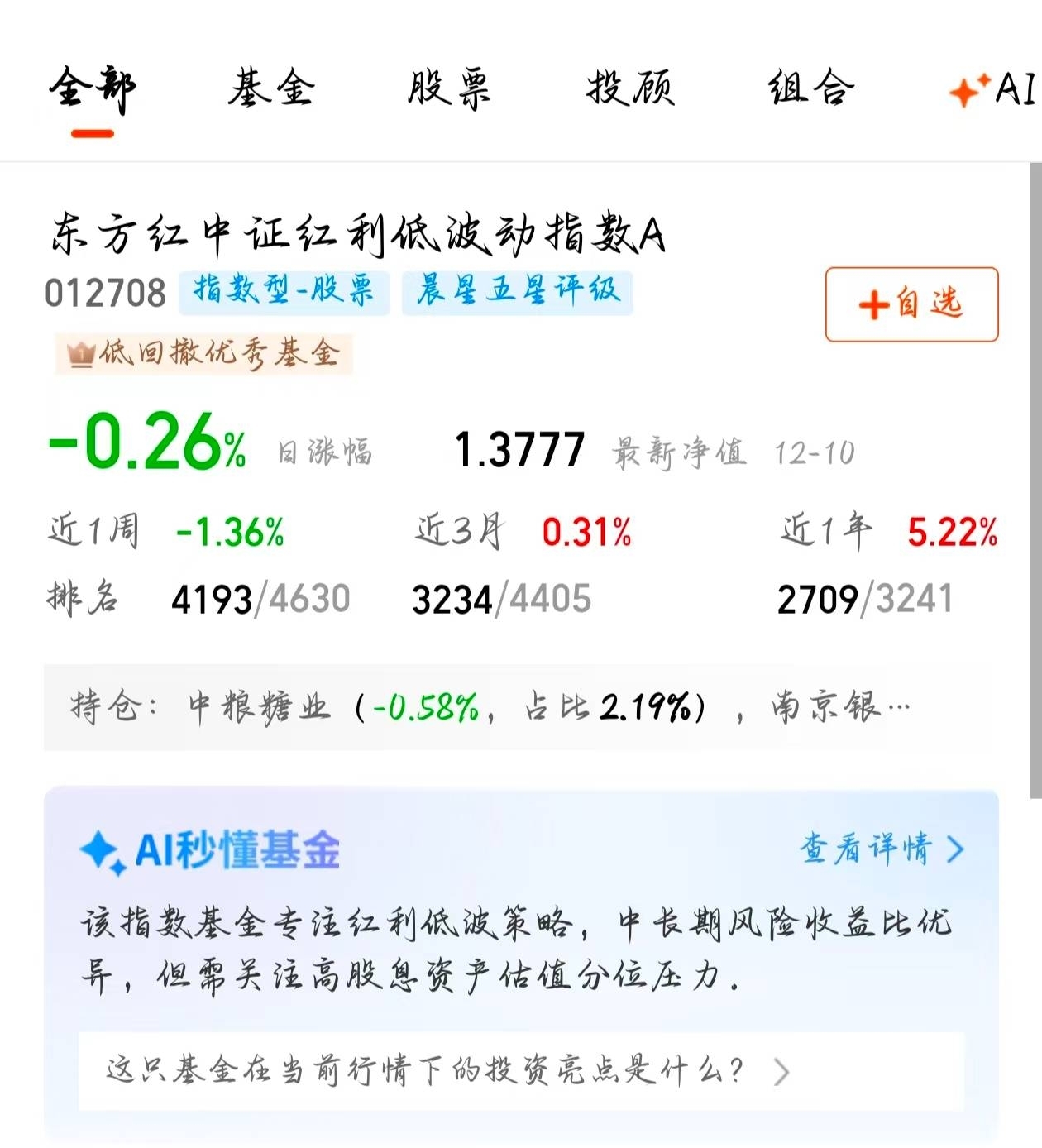 年末想要求稳的话,就看看东方红中证红利低波动指数A吧。持仓分散波动小,近六个月0.31%的收益虽然不算高,但拿着让人安心,降息环境下这种稳健更重要。