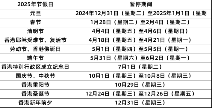 下列节假日期间的相关业务安排届时可不再另行公告,敬请投资者及早做好交易安排,避免因假期原因带来不便。