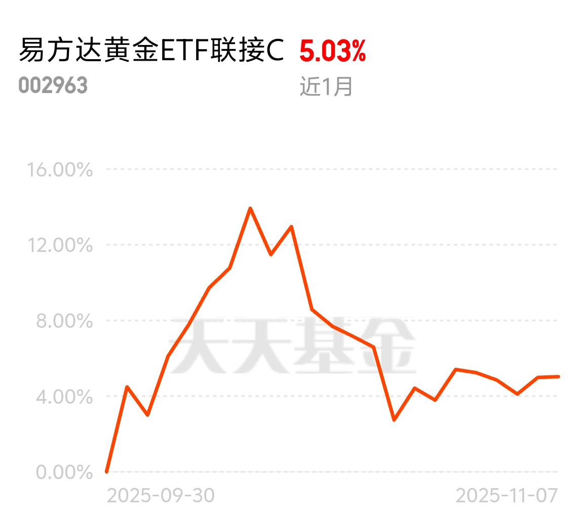 很多新手投资者想参与黄金市场,但不知道从何入手,担心复杂的操作和高门槛。易方达黄金ETF联接C近1个月涨了5.03%,简单易上手,在普通理财平台就能购买,新手也能轻松玩转黄金投资。