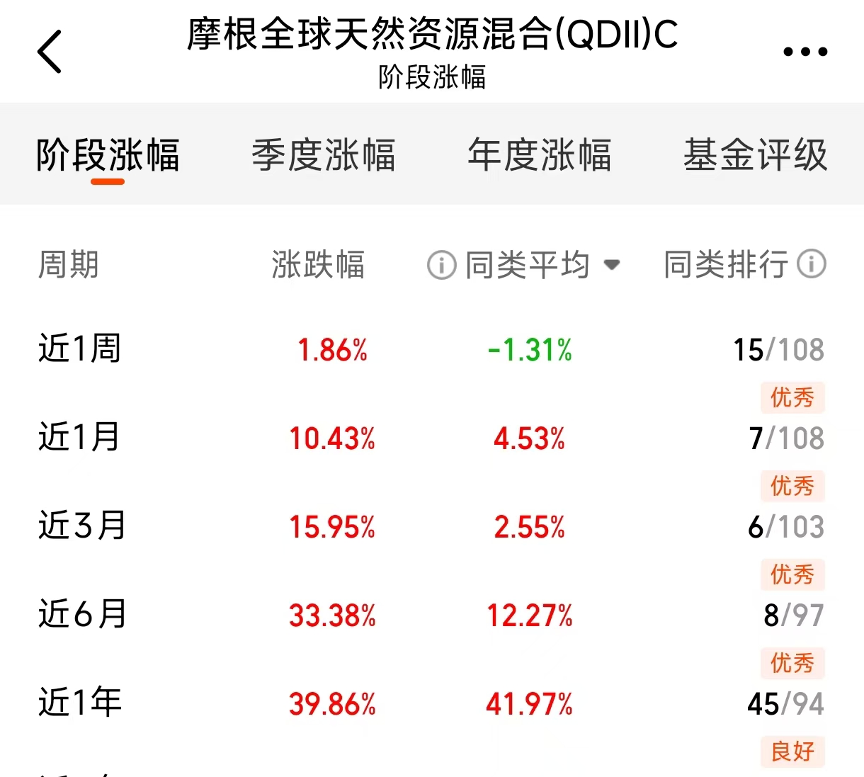 早上看新闻说黄金价格调整了,现货黄金失守4800美元,单一商品就是容易受消息影响,不如摩根全球天然资源混合C这种全球布局的产品稳健。最近地缘政治风险虽然短期缓和但长期还在,资源品的避险属性根本挡不住,你看黄金虽然今天回调但年初以来涨幅还超过10%,白银更是涨了接近30%,这种环境下重金属和能源价格还是有支撑。我今天也买了点$摩根全球天然资源混合(QDII)C$(019578),这基金昨天净值涨了1.10%,今天估值又涨0.67%,真的很能涨而且跌幅又小,近一个月涨了10.89%,近一年收益接近40%,表现确实稳健。它主要投资全球黄金公司、石油公司和矿产资源企业,不是直接买商品期货,而是通过投资这些公司的股票来参与行情,覆盖范围特别广。现在全球有色金属价格都在上涨,但真正的大机会其实在这些资源公司身上,它们手里有矿有资源,产品布局全球优质资源企业,这种机会真的不多见。我看摩根这只产品现在只开了10万额度,这类QDII资源基金额度都很紧张,之前那些原油基金现在都限购得很厉害,这个机会确实要抓紧,额度用完就没了。#CPU概念突然大火:巨头产能已被预订一空#