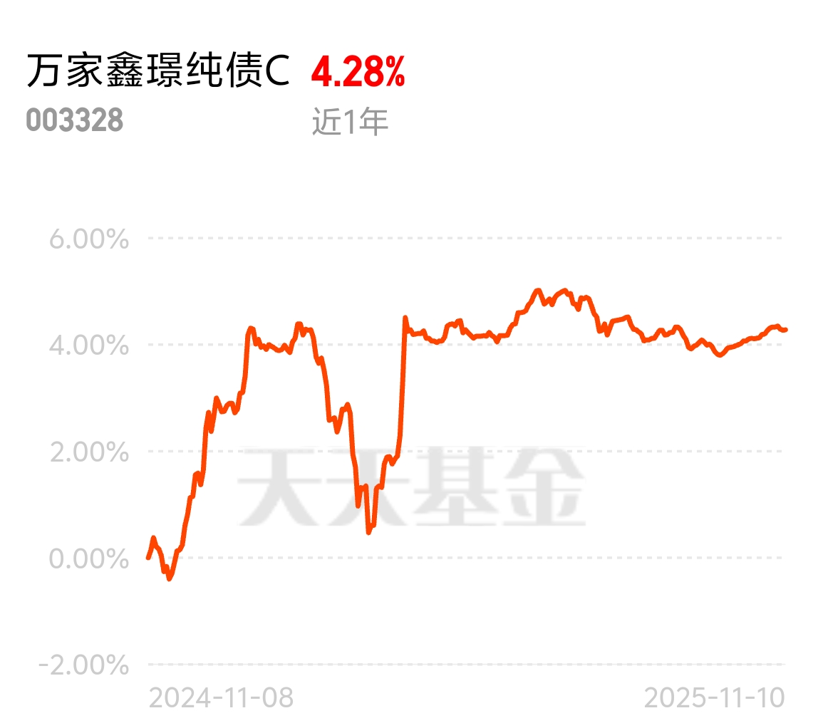 近一年涨4.28%,还是挺稳的,要看它长期收益才有参考价值,投资不是一两天的时间$万家鑫璟纯债C$
