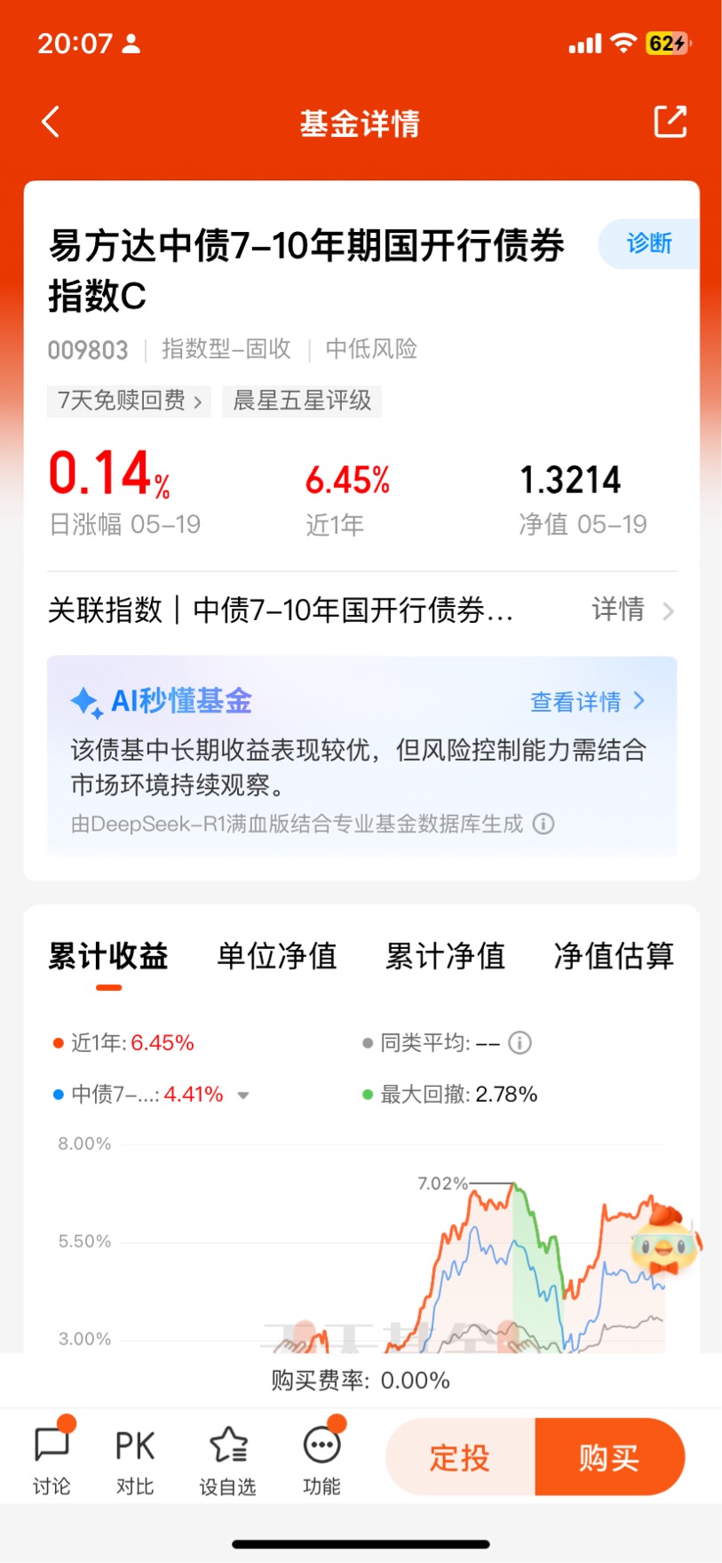 $易方达中债7-10年期国开行债券指数C$今天收了14个蛋,近一年收益回报6.5