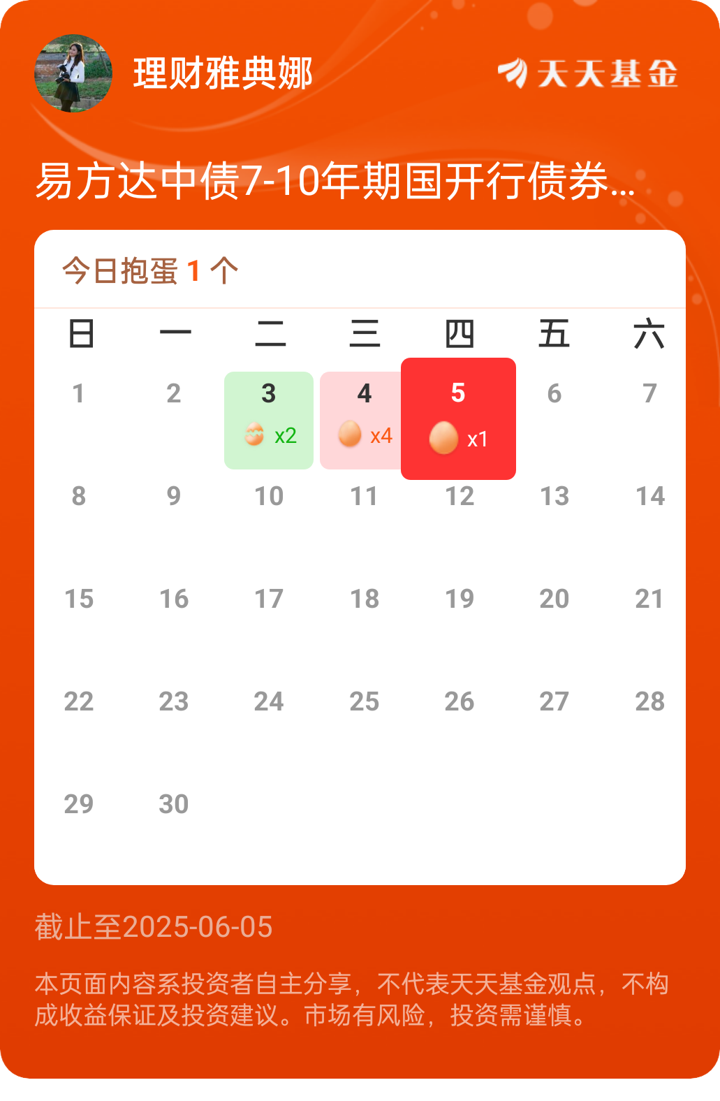 今日收蛋1个。易方达中债7-10年期国开行债券指数A具有以下特点:1,有较低的风