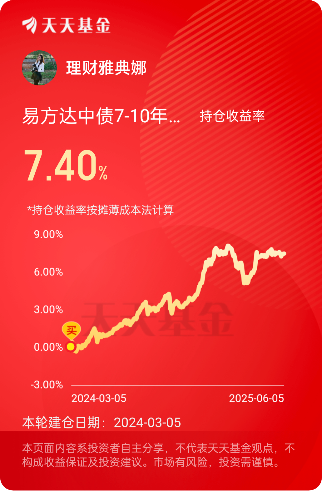 我个人看好的是易方达中债7-10年期国开行债券指数A,该基金作为一款优质的纯债基金产品,给我的感观就是收益稳稳,不用操心,堪比投资路上的坚强后卫。