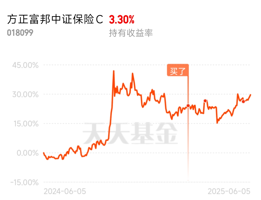 在市场波动较大的情况下,我选择了保险板块作为避险资产。这个板块不仅具备稳定的盈利能力和持续分红,而且波动率较低。我持有的“方正富邦保险主题指数C”近一个月上涨9.11%,过去一年回报29.72%,非常适合长期持有。$方正富邦中证保险C$