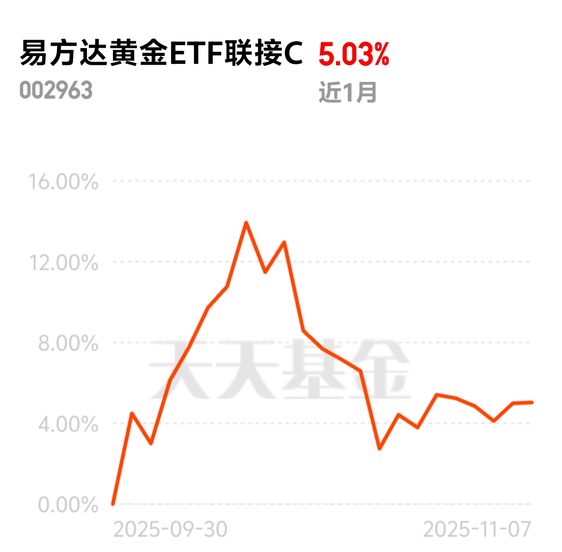 现在市场上的投资机会不少,但靠谱又稳健的不多,黄金投资一直是热门且稳妥的选择。易方达黄金ETF联接C近1个月涨了5.03%,费用低廉,管理费率不高,长期持有成本低,性价比很高。