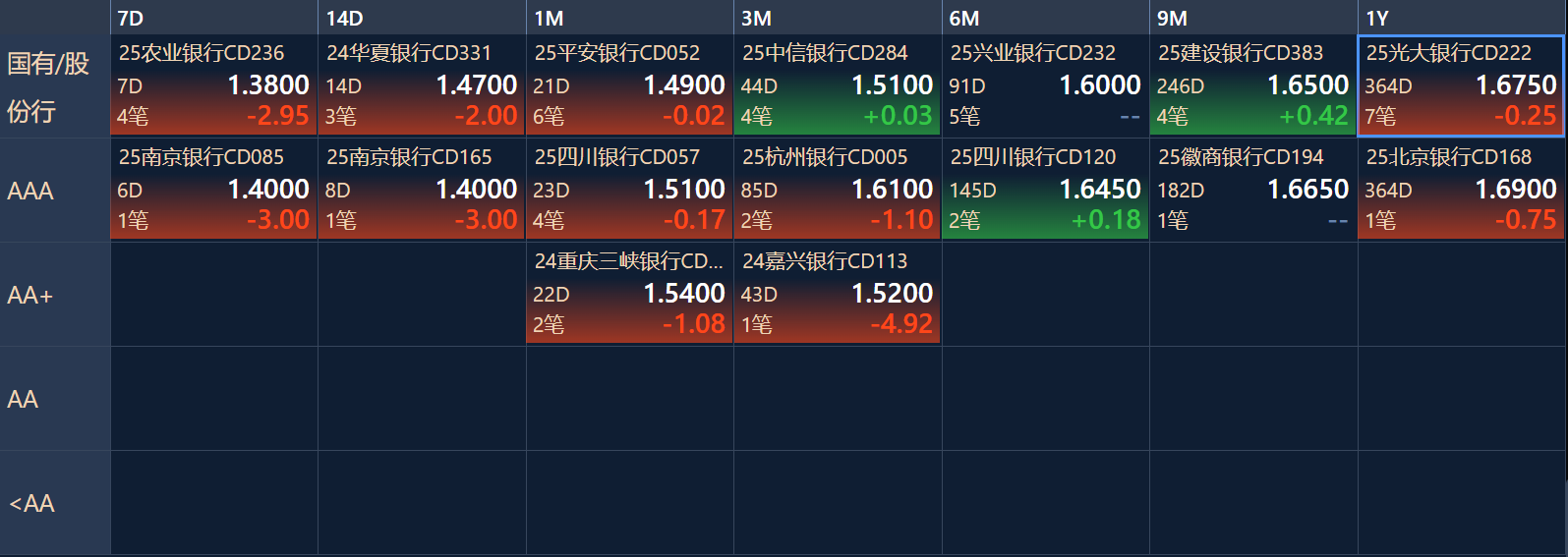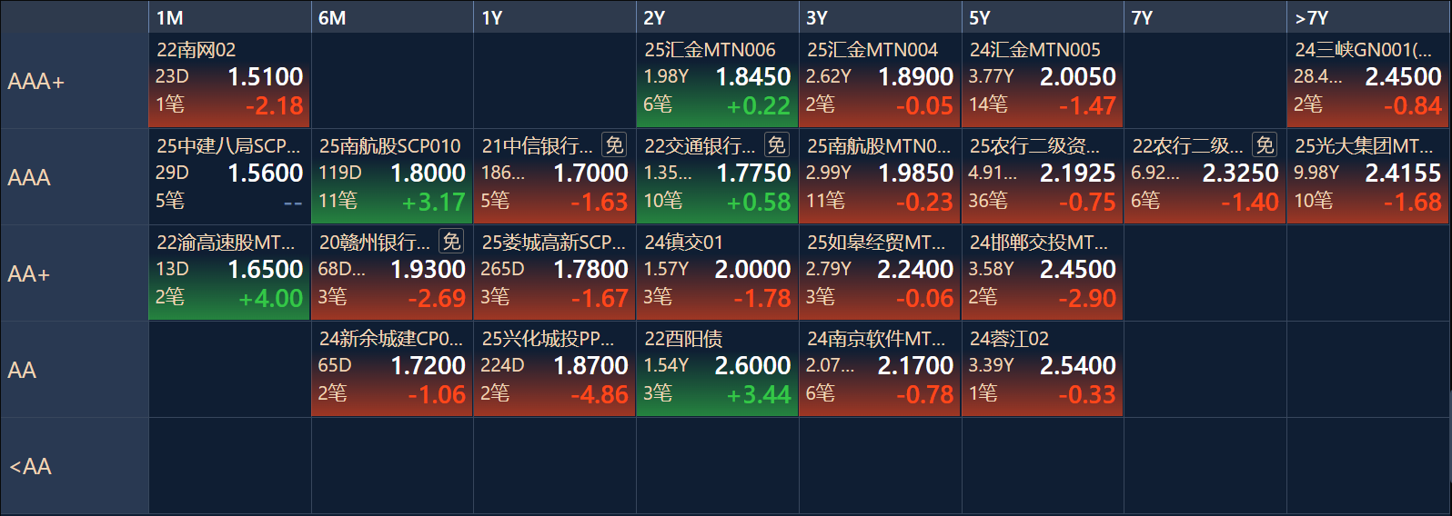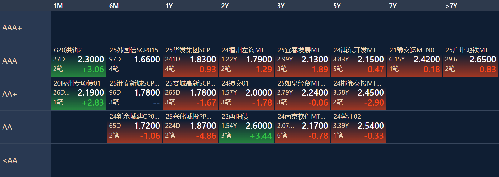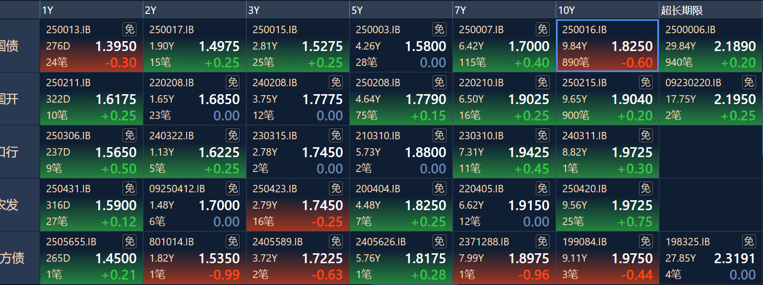盘中利率债多数转跌,而信用债由于有滞后性,盘面飘红,10Y国债活跃券切至250016,前天续发的券规模上来了,所以大家矩阵图10Y国债活跃券收益率在1.825%,建议看250011更符合目前。