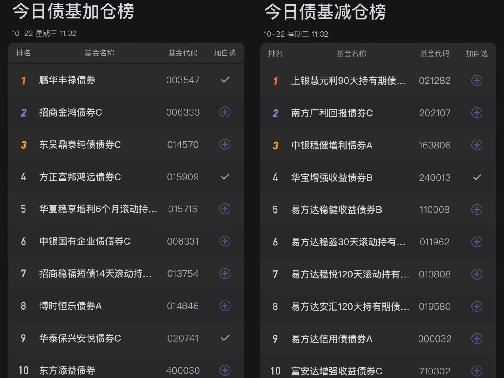 截止11点30分,华子碎17个,南方中债碎2个,方正富邦鸿远碎19个,富国优化增强碎5-15个,中邮恒利碎10-20个,博时恒乐碎0-10个,最终数据已17点收盘为准。