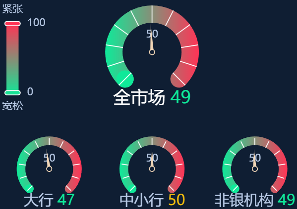 六、资金面情绪指数:全市场49 资金面维稳 (0-100紧张度递增,50为均衡,超过50反映资金紧张)