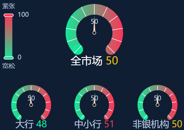 六、资金面情绪指数:全市场50 资金面紧平衡 (0-100紧张度递增,50为均衡,超过50反映资金紧张)