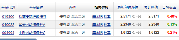 今天市场回调,前面涨多了,回调一下是好事,能跌才能涨,不过还是要先做好资产配置; 不少人选了进取型的债券基金,比如可转债,固收加等;这一两年这类基金表现确实不错;昨天表现如下