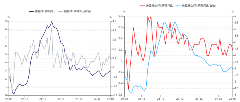 9月核心商品、食品、能源价格受关税影响较多,虽然仅有能源价格上行,但核心商品和食品价格仍能在高基数背景下维持并不弱的环比增速。相比受关税影响较小的核心服务以及房租分项,其表现明显更加强劲。