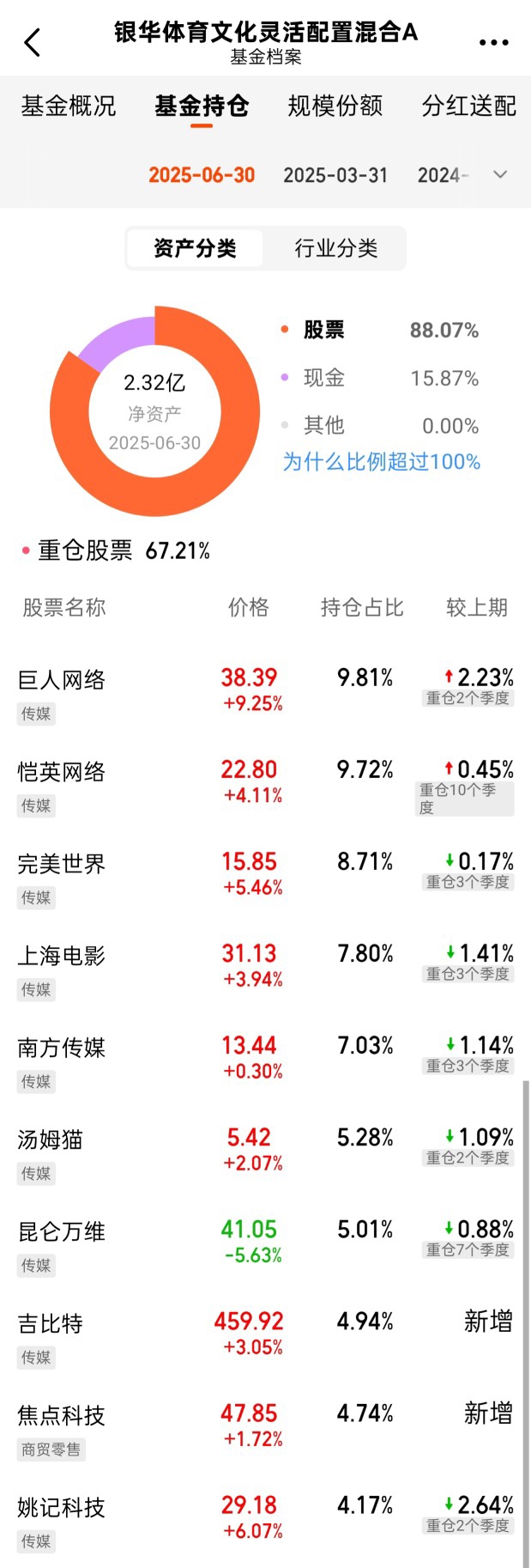 基金的资产配置数据也印证了这一点。根据上海证券的数据(截至2025年二季度),该基金的股票仓位高达91.85%,展现了非常积极进取的姿态。而其重仓行业高度集中在传媒、计算机等领域,这与基金实际持仓也是吻合的。