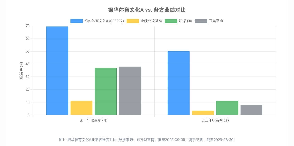 业绩表现:惊人的Alpha。“战绩”是评价一位将军最直接的方式。银华体育文化A的过往业绩,尤其是近一年来的表现,堪称惊艳。将其与市场主流指数、同类基金平均水平及自身业绩基准进行对比,其创造超额收益(Alpha)的能力一目了然。方便直观了解,制作图示如下: