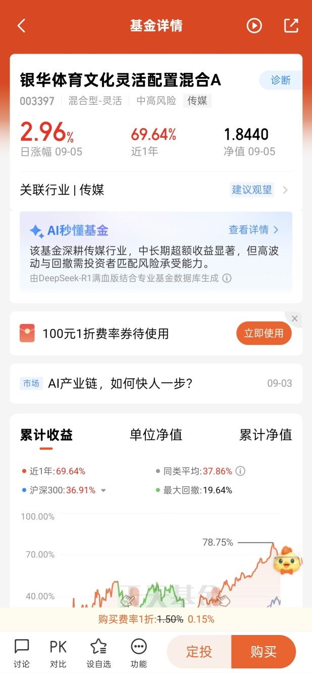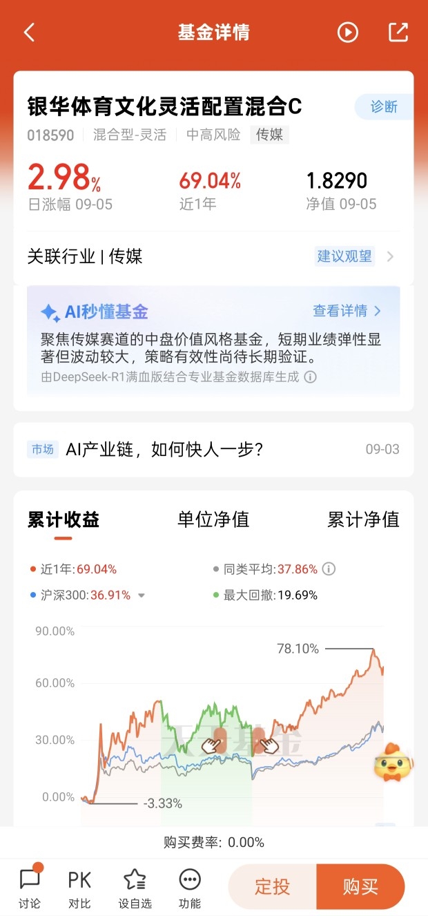 $银华体育文化灵活配置混合A$ 不是一只投资于传统体育或文化的基金。它是一只由具备清晰前瞻性视野的基金经理唐能主理,投资逻辑(看好AI应用优于算力)与实际持仓(重仓游戏、传媒、营销等AI应用股)高度统一,投资风格锐利、持仓高度集中、中高风险高弹性的“AI应用主题基金”。它的成功,是基金经理对科技产业趋势的深刻洞察和果断执行力的结果。