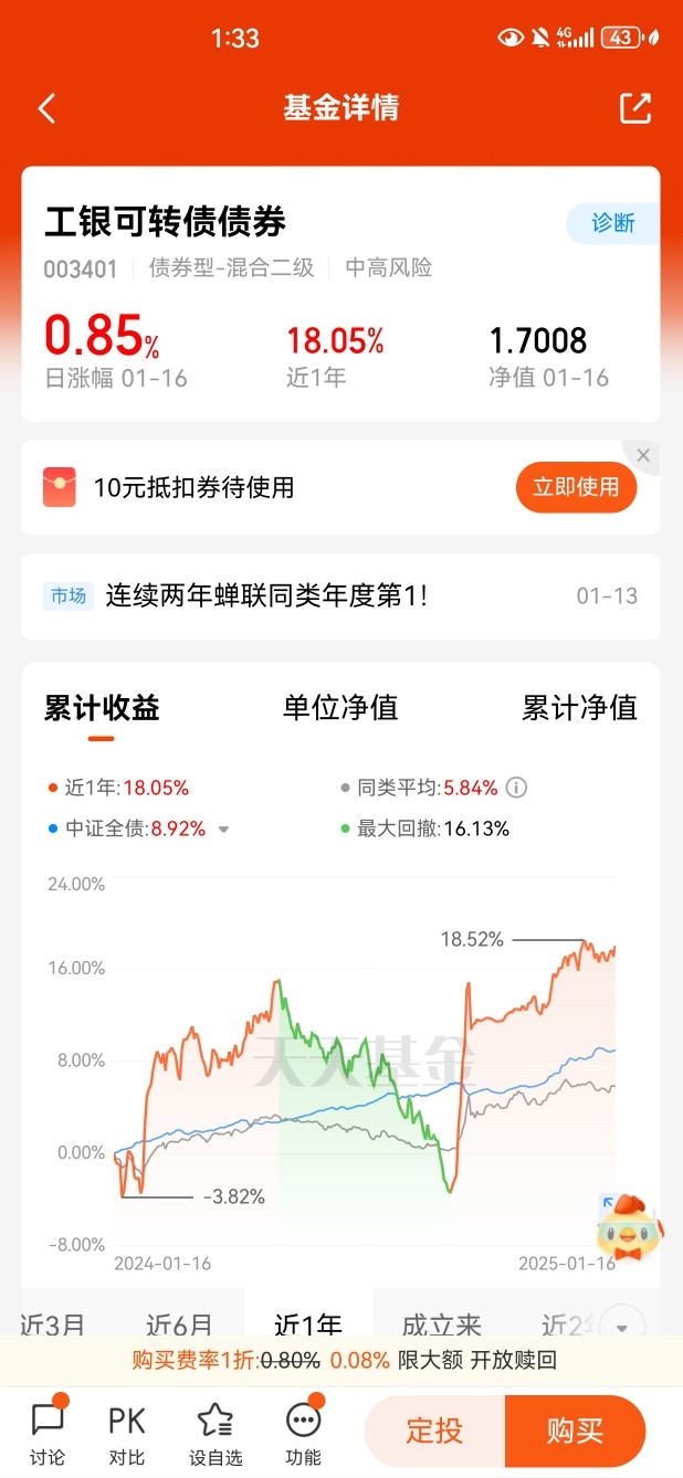 #宝藏基#打卡第二天,2025年1月17日,工银可转债债券(003401)的市场表现较为稳健。根据新浪财经的数据,该基金的单位净值为1.7008元,当日涨跌幅为0.85%。从近期表现来看,近3月涨幅为5.78%,近1年涨幅为18.05%,显示出较好的收益能力。在同类二级债基中,该基金的排名也较为靠前,近1年净值增长率排名第7,表现优于同类平均。此外,该基金的资产规模为29.89亿,显示出较强的市场认可度。总体而言,工银可转债债券在当前市场环境下表现良好,具有一定的投资价值。@工银瑞信基金