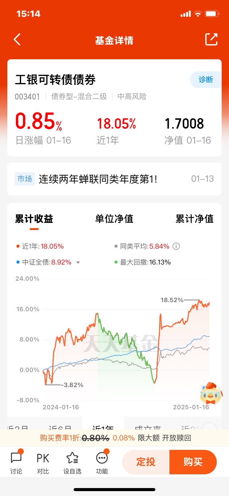 $工银可转债债券$ 在2024年和2023年连续两年获得同类年度排名第一,这样的成绩背后,是黄诗原对市场趋势的准确判断和精细化的投资管理。他深知市场风格的短期轮动是难以捕捉的,因此他更倾向于长期持有,这种策略在波动较大的市场中更具有优势。