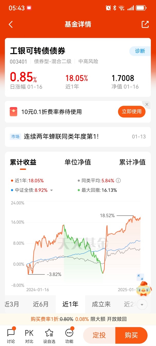 #宝藏基#打卡第1天 什么是“宝藏基”呢?我认为首先这只基金得赚钱,工银可转债债券2023、2024年度均为同类基金中第一名,其中2023年收益率15.06%、2024年收益率18.67%。如果还不知道买什么的基民朋友们可以大胆买入了,可转债本身下有保底,上不封顶,加之股市上蹿下跳,银行存款利息不断下降,购买可转债债券基金,从而赚得稳定的超额收益是个不错的选择哦。最后,祝各位关注、持有的基民朋友们蛇年吉祥,大大发财!