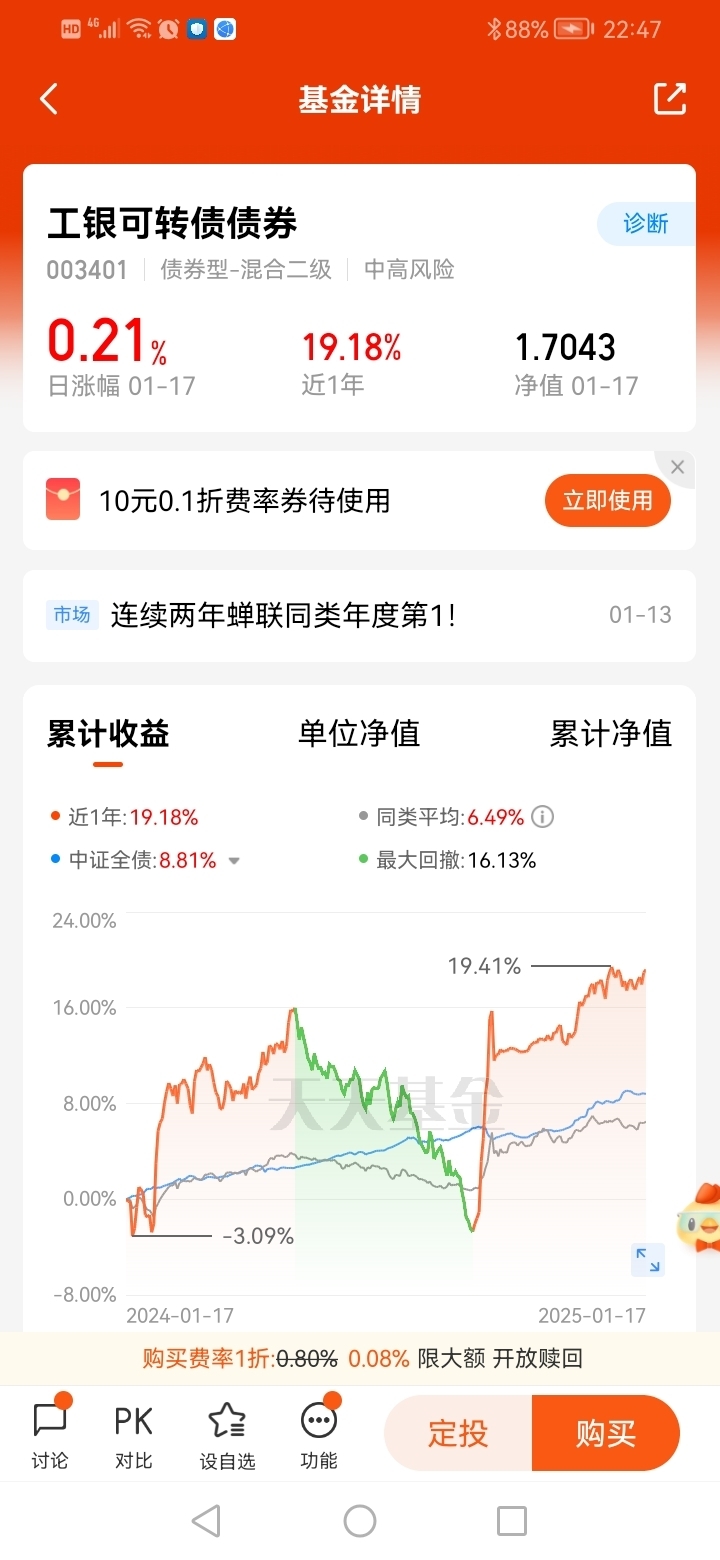 #宝藏基#打卡第4天,看好$工银可转债债券$ ,具备股和债的双重属性,让资产配置更加灵活多元,进可攻、退可守。可转债作为有权益属性的资产,受益于降准后的流动性宽松,配置可转债可以提升分散化水平,震荡市场要配置增强收益。看好基金经理黄诗原,工银可转债债券2024年、2023年连续两年蝉联同类年度排名第1,2024年收益率达18.67%,2023年收益率达15.06%,业绩优秀!看好$工银聚安混合C$ 为偏债混合类产品,业绩表现亮眼,同样摘得2024年度同类排名第1,收益不错!@工银瑞信基金