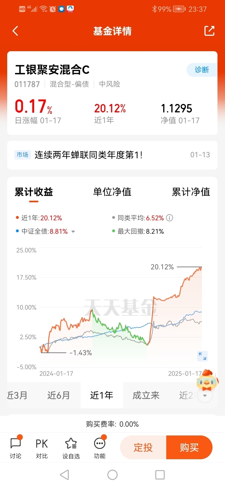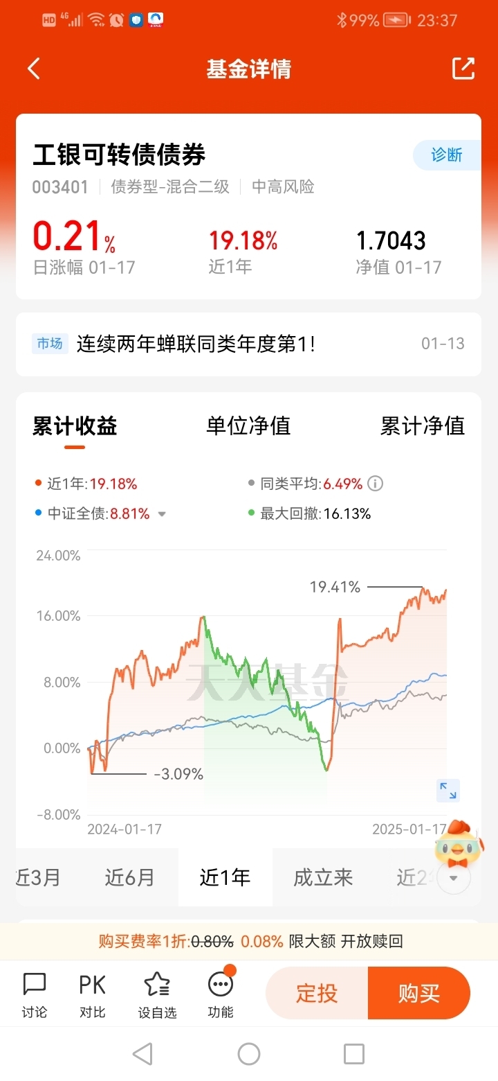 #宝藏基#打卡第4天,看好$工银可转债债券$ ,可转债是一种“特殊”的债券,它具有固定的票面利率和到期日,同时在一定条件下有权转换为发行公司股票,同时具备股和债的“双重属性”,可以进行股债转换。工银可转债收益不错的,看好基金经理黄诗原,经验丰富,工银可转债债券2024年、2023年连续两年蝉联同类年度排名第1,2024年收益率达18.67%,2023年收益率达15.06%,业绩优秀!同样他管理的$工银聚安混合C$ ,摘得2024年度同类排名第1!当下震荡市场有必要在基金组合中配置获得收益。@工银瑞信基金