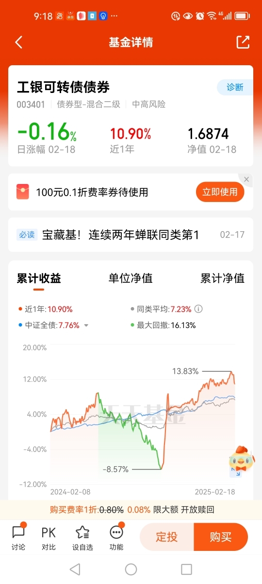 #攻守兼备宝藏冠军基#打卡第四天。$工银可转债债券(003401)$主投可转债、股票及利率债,策略上用可转债买卖差价,优选个股,利率债做固收打底。当股市向好时,可转债、股票放手进攻,力争把握上涨机会;当债市向好时,利率债赚收益;当市场波动时,通过股债对冲策略,力争获取稳健收益。该基金通过股债搭配灵活策略,截止到今年2月18日,在近2年低迷的市场中,依然为投资者获得了30.88%的涨幅,在同类排行第3/935。