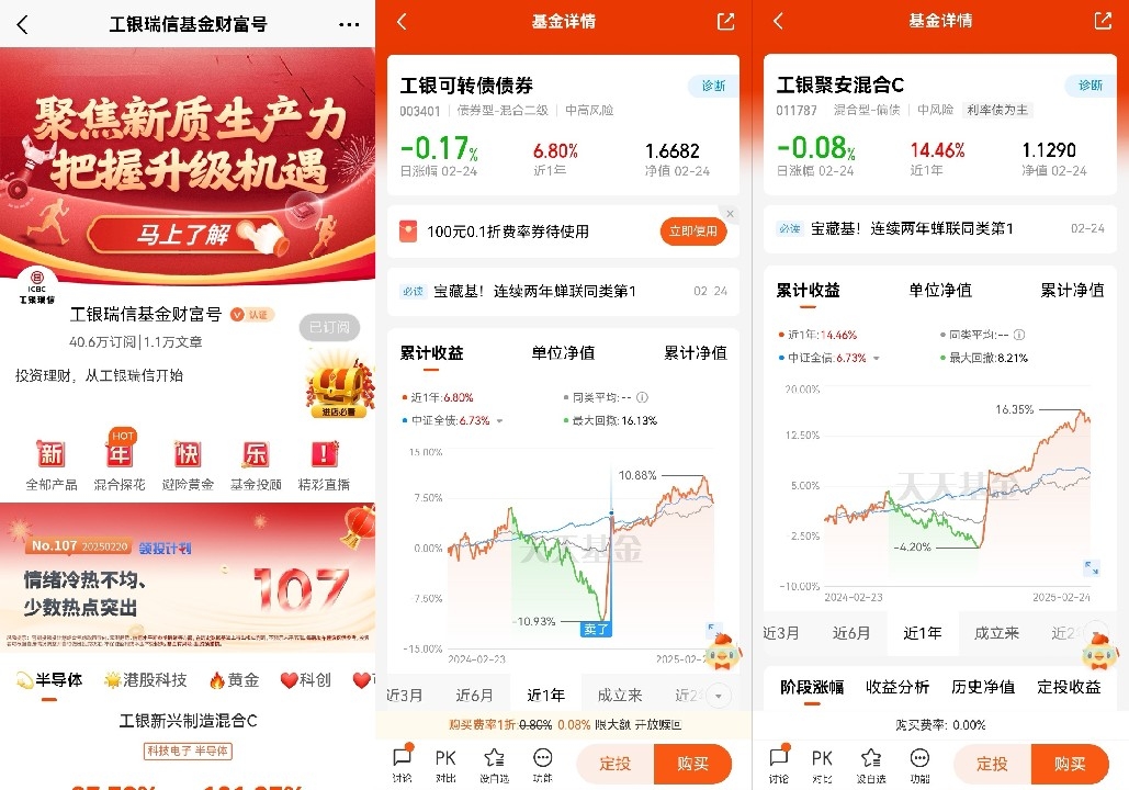 #攻守兼备宝藏冠军基#+打卡第11天+今天市场压力源于外盘阿里大跌,虽然有收复失地的进攻性,但整体被拖累,加上确实是对科技层面产生的冲击,以及近期快速上涨借机获利了结,出现调整可以理解,这也成为了今天债市开门红的原因之一,但是今天的债市整体呈现V型,个人觉着这波调整还未范围,面对两边风波未定,不妨选择到风险与收益居中的可转债,通过可转债转正股提供进攻性,加上债券本身的防御能力,在风险偏低一些的情况下,获取股票进攻所带来的超额,$工银可转债债券$ 近两年带来了非常不错的表现,凭借对于可转债券的前瞻性投资有效获取超额,近期出现回调,结合所投资股票与可转债类型,可以关注低吸上车时机。@工银瑞信基金