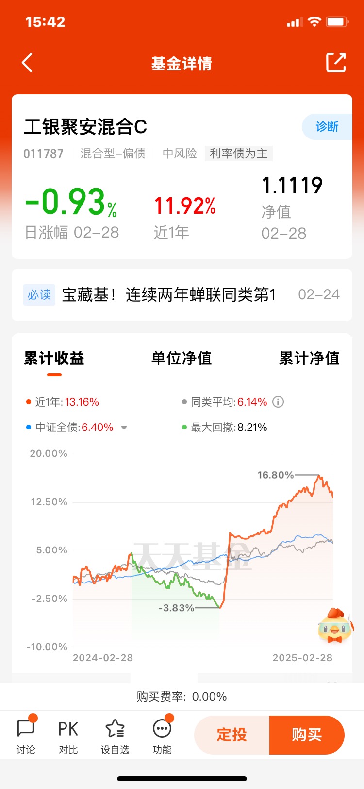 2. 混合策略的灵活平衡,$工银聚安混合C$作为偏债混合型基金,股票仓位长期维持在30%-40%区间,通过“债基打底+权益增强”实现收益优化。2024年其以同类第一的排名收官,最大回撤仅-8.21%,远低于混合型基金平均水平。从持仓看,该基金偏好高壁垒行业龙头股,并动态调整久期以应对债市波动。例如,2024年二季度,组合通过降低债券久期并维持高权益仓位,成功抵御了纯债产品的普遍回撤。