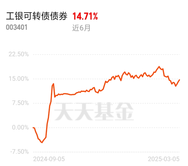 #攻守兼备宝藏冠军基#打卡第21天,昨天市场整体呈现出震荡分化的态势,A股板块热点轮动,部分周期和消费板块表现亮眼,而港股市场则在科技股的带动下出现一定反弹。在这样的市场环境下,工银可转债债券 最新净值1.6724元,日涨幅达0.52%,近6个月收益率14.71% ,在同类基金中排名98|926,表现较为出色。可转债本身兼具股性和债性,在股市向好时,可通过转股分享股价上涨红利,市场不佳时,又能保留债券属性获取稳定利息,这使得 工银可转债债券 进可攻退可守,在市场波动中具备较强适应性。