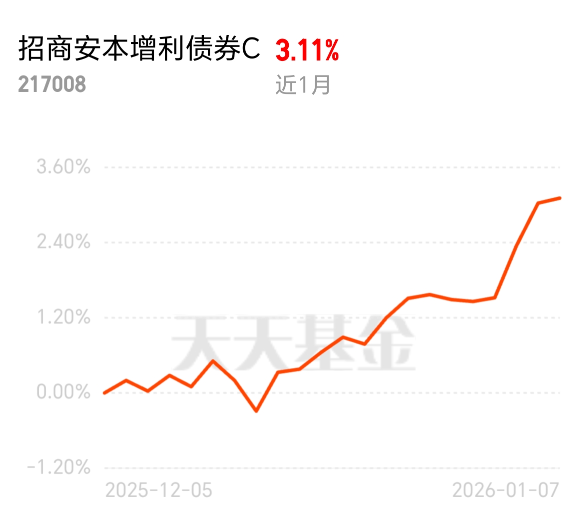 纯债收益越来越难满足需求,固收 + 市场里好产品难寻。招商安本增利债券 C 近 1 月收益 3.11%,比很多同类固收 + 表现都好,固收打底稳如泰山,就算配点股票增强也安心,招商实力靠谱。$招商安本增利债券C$