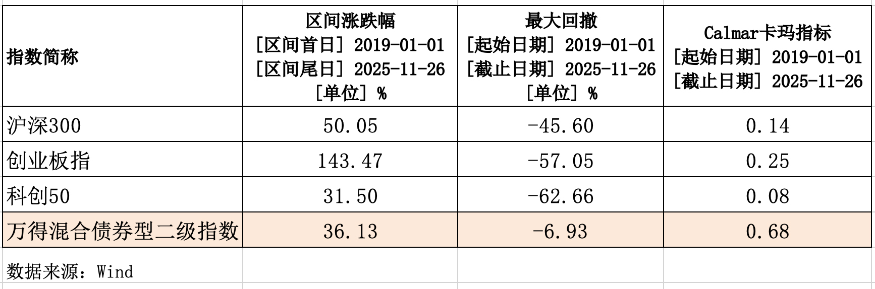 再看债券基金的数据表现,以“二级债基”(上表中的万得混合债券型二级指数)为例,上述区间上涨36.13%,最大回撤-6.93%。