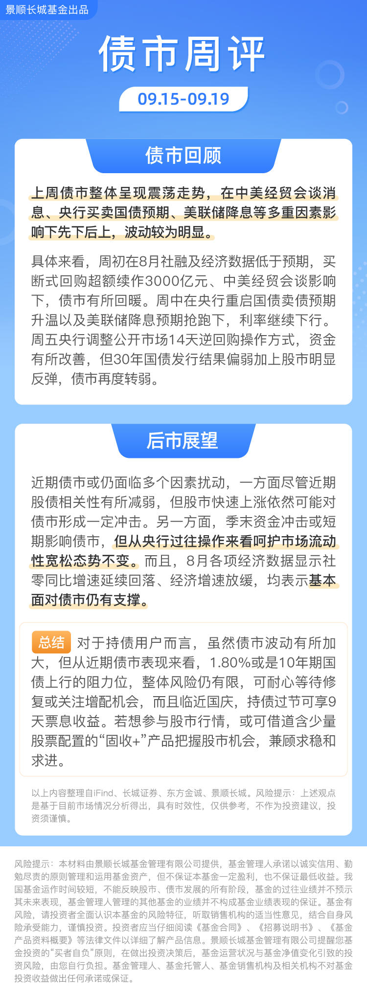 上周债市整体呈现震荡走势,在中美经贸会谈消息、央行买卖国债预期、美联储降息等多重因素影响下先下后上,波动较为明显。本周债市再遇调整,如何应对?临近国庆,持债过节还是持币过节?债市周评为你解读~