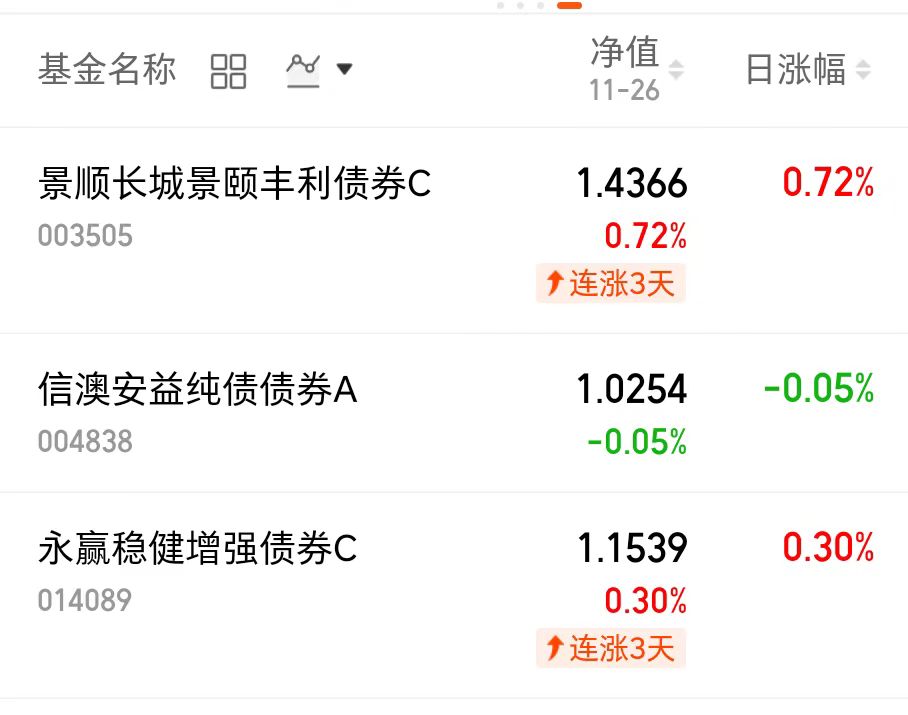 伙伴们,今天行情开启了4连涨趋势,$景顺长城景颐丰利债券C(OTCFUND|003505)$昨天收蛋72个,连续收蛋三天了,而且最近两天都是收的恐龙蛋,表现特别好,对比一圈就它表现亮眼。市场轮动快,拿景颐丰利这种股债混合的心里不慌, 业绩也一直不错。