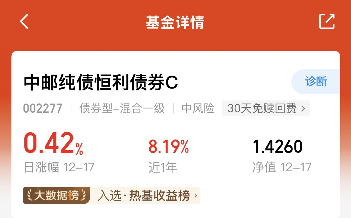 这还是债基吗,怎么这么厉害,我以为$中邮纯债恒利债券C$昨天42个蛋已经很多了,