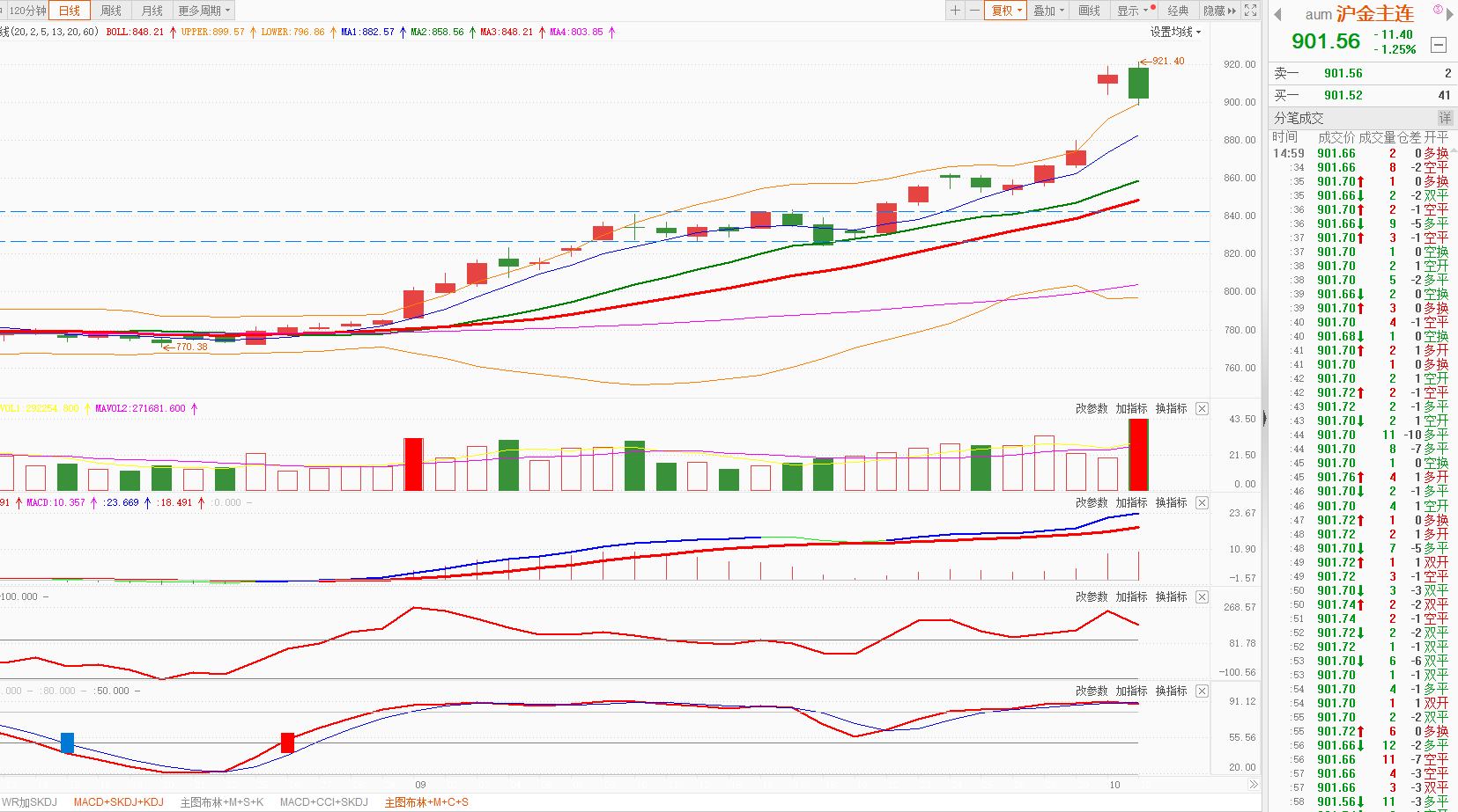 沪金主连:跌1.25%,日K线在5日均线之上。今天沪金下跌,日K线仍在布林线上轨之上,昨天大幅跳空上涨后,短期获利盘涌出,抛压较重,但由于推动黄金上涨的内因仍在,短期需要整理,长期可能仍有上行空间。仓位较低的和配置盘可逢低买入。