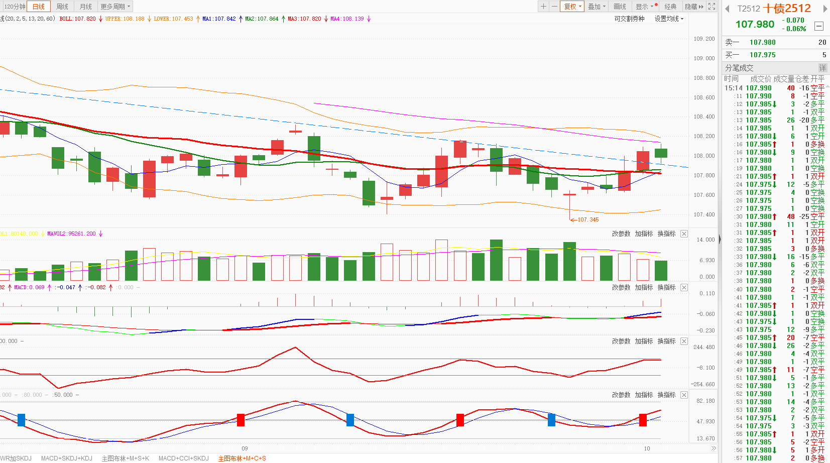 今天10年国债期货小幅高开后冲高回落,跌0.06%,日K线在5、10、20日均线之上。