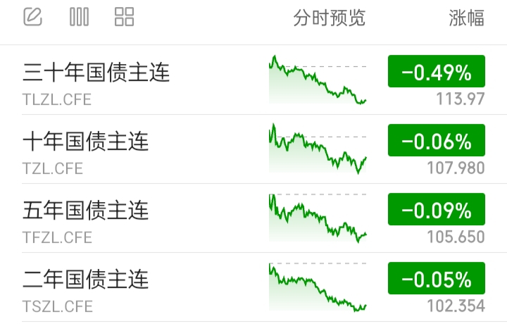 今天5、10年国债期货日K线收盘后在5日均线之上,2、30年国债期货日K线收盘后在5日均线之下,整体走势偏弱。