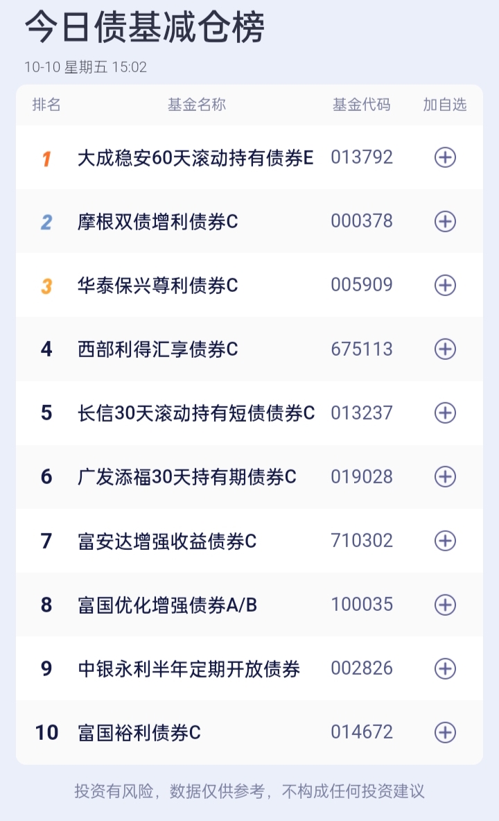 八、债券基金加、减仓榜(截止到15:00收盘)