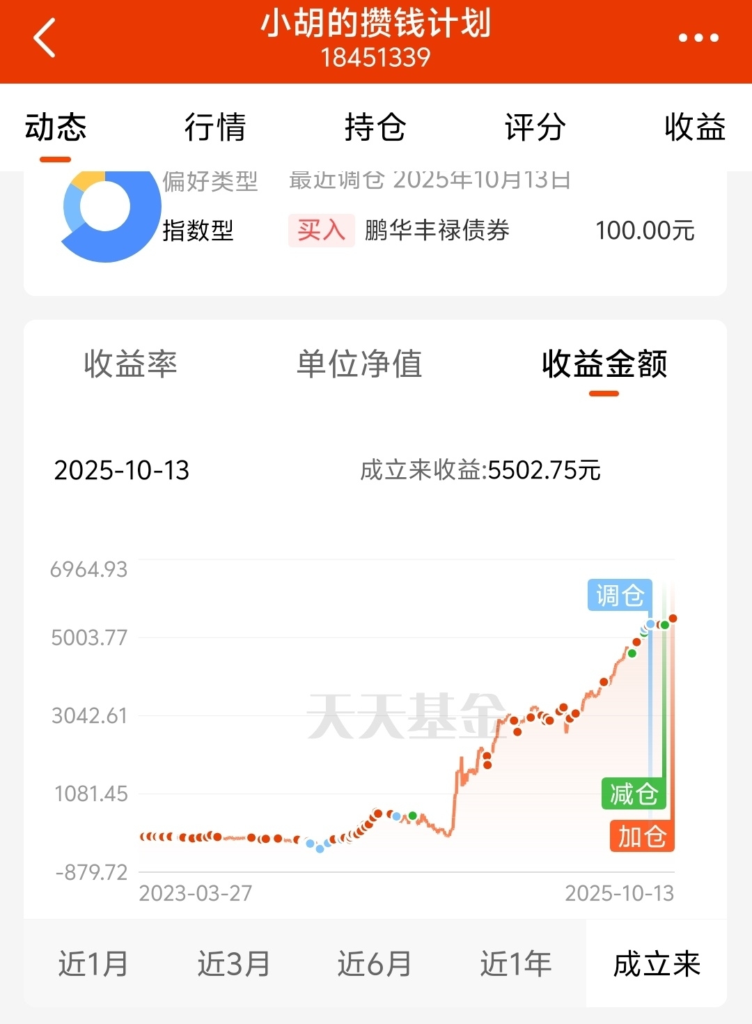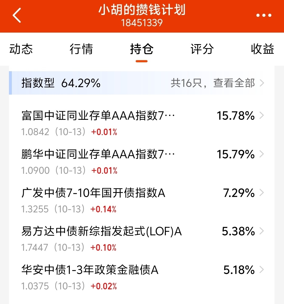 其中,[小胡的攒钱计划]是平衡之星自己效仿在天天基金平台上关注的一些投顾组合的资产配置结构搭建的组合。这个组合,我融入了自己的理财需求和投资理念,先求稳,再追求一点弹性收益。我的做法是重仓产品配货币基金,同业存单指数基金和短债基金。这三类产品为组合获得市场最基础的低风险收益打下坚实的基础。在此基础上, 中长期利率债基,信用债基徐徐粉墨登场。债基内部细分品种配置的再好,遇到债券整体震荡调整,持有体验感可能还是有所欠缺,尤其是国内经常上演股债跷跷板效应的剧本。所以,往组合里加入一点权益仓位还是非常有必要的。