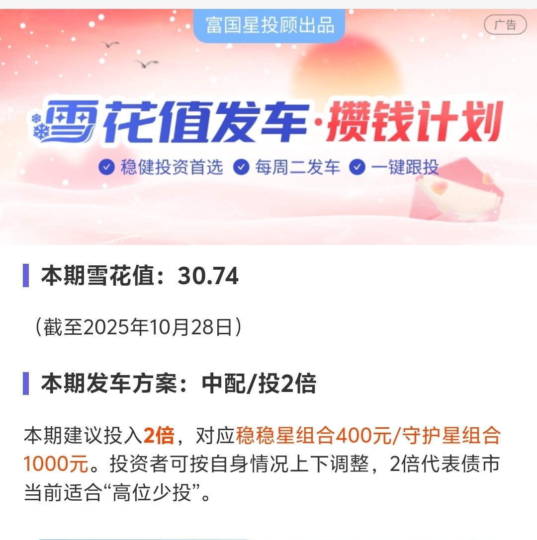审视当前组合整体配置结构,后续会持续关注富国基金星投顾出品的雪花值的变化决定加仓的债基的频率,加仓的方向会侧重信用债基的配置。