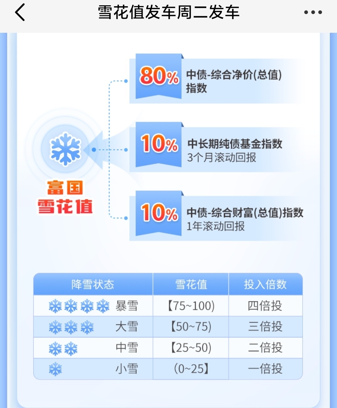 债基怎么投?富国星投顾推出了一个买入指标-雪花值。类似于反应权益宽基估值水平的一个指标,只不过,雪花值是数值越大,往往代表债市处于熊市阶段,债券收益率经历了大幅上行,债券价格大幅下跌,纯债债券基金普遍收益率不佳,而权益基金逆向思维告诉我们,债券熊市买债基,未来预期收获正收益率是大概率的事情!