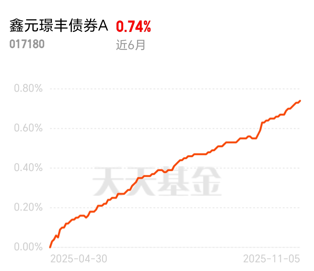 债市近期走势平稳,成了很多人资产配置的“压舱石”。鑫元璟丰债券A在这种行情里很出彩,近6个月收益有0.74%,不投股票更稳健,适合看重安稳的人。