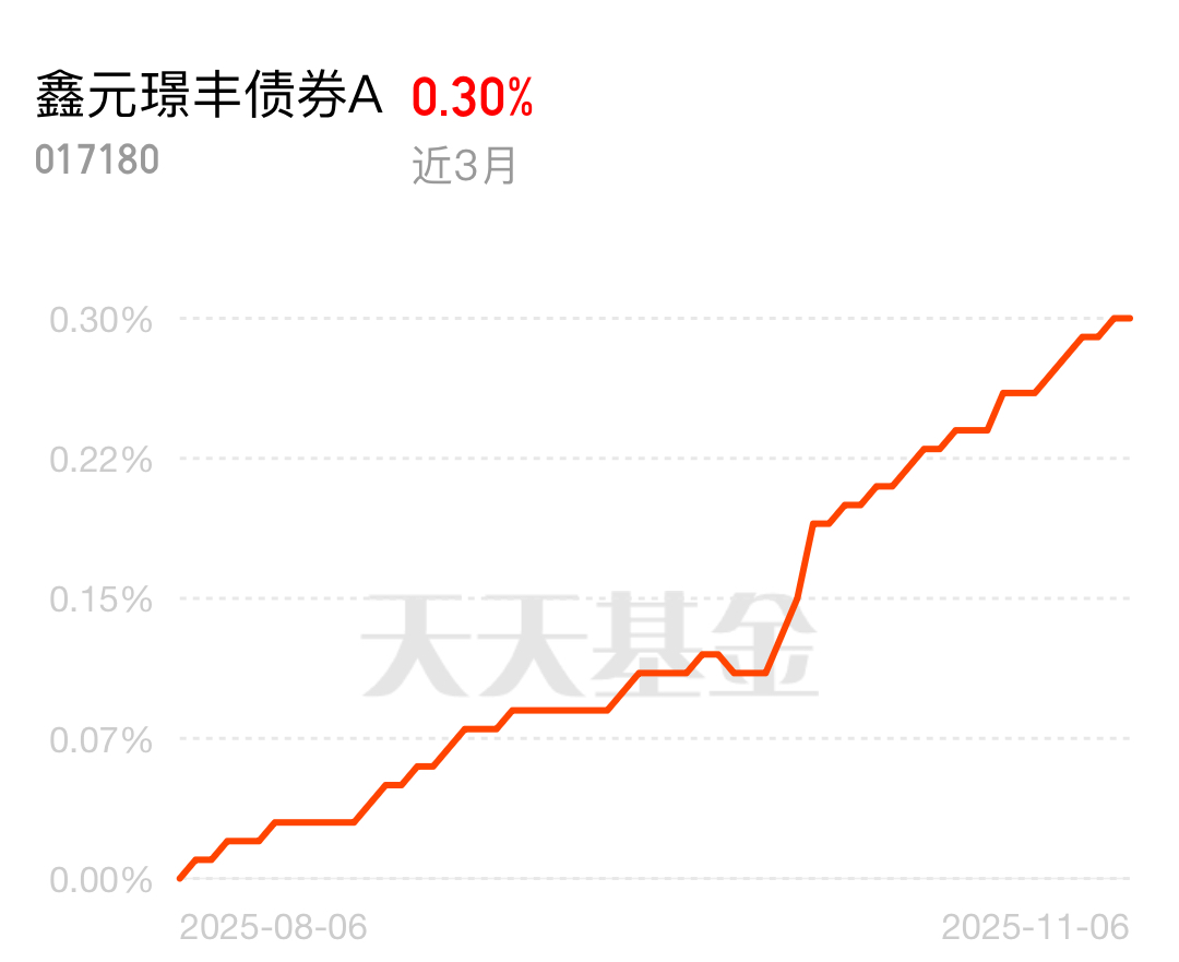 现在大家理财都看重“稳”字当头,不想被市场起伏折腾。鑫元璟丰债券A没让人失望,近3个月收益0.30%,凭借稳健的投资策略,在震荡市中保持收益稳定,是普通投资者的安心之选。