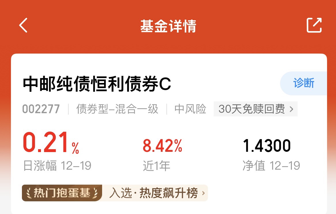 债基就不要动来动去了,这就是拿时间换收益的,我在$中邮纯债恒利债券C$上周五收蛋