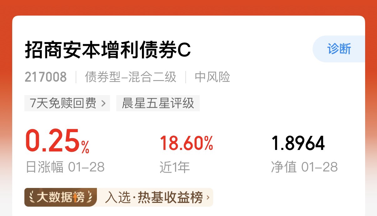 这两天的市场还是可以的,但是我看权益市场这边板块能动的还是比较快,相比起这种节奏快的,我更喜欢去那种比较稳一点的。固收就比较合适,$招商安本增利债券C$ 昨天收了25个蛋,这种基本上就是入了就不用去管它了,能吃肉,但基本上也不会大跌,尤其是快过年了,把钱放在股市,害怕把收益亏没,这个就是最好的选择