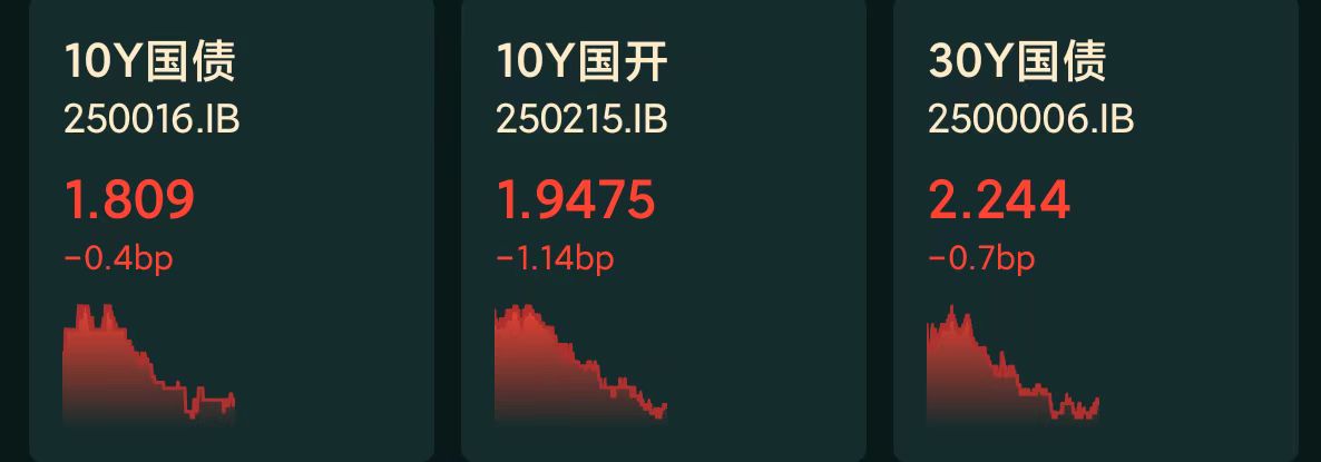 十年期国债收益率:1.809%,-0.4BP(国债收益率越跌,债市越涨)