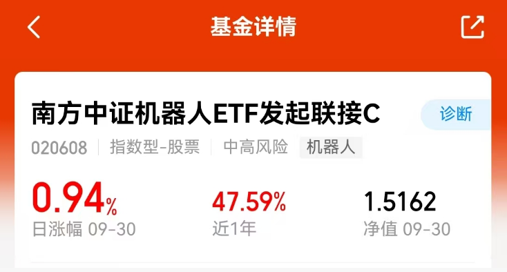 最近机器人行业很热,但不是没有道理。从制造业到服务业,对自动化和智能化的需求是实实在在的。$南方中证机器人ETF发起联接C$(020608)让我们能一键布局产业链上下游。其近一年47.88%的年化收益和近三个月近27%的涨幅吸引了众多目光。这种指数化投资,比较适合我们大多数非专业投资者,省心省力。机器人产业的发展浪潮可能带来长期的投资机会。#分享国庆见闻,晒收益,瓜分好礼!#