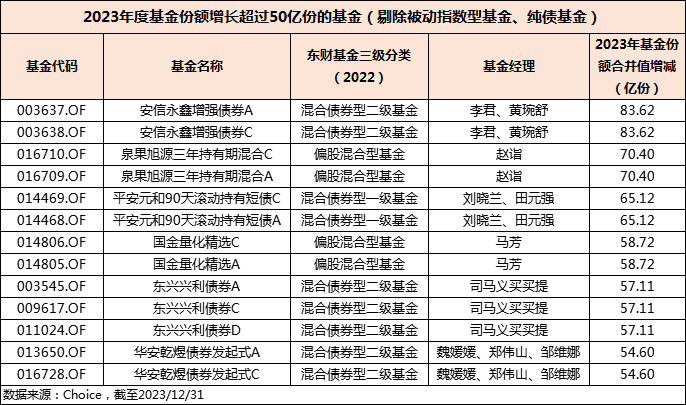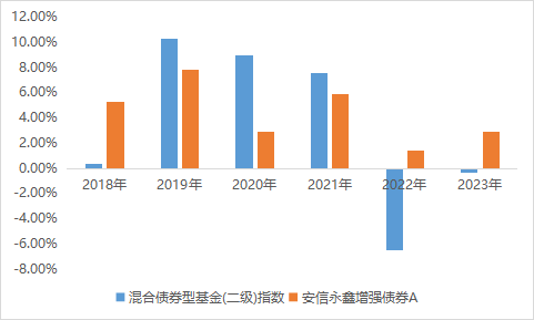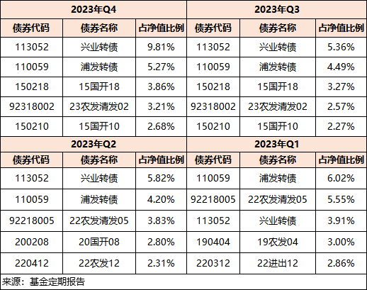 2023Q4季报披露完毕了,一如既往,我会看基金份额的变化,以此观察基民在买什么。 梳理2023全年的数据,剔除被动指数型基金、纯债基金,安信永鑫增强债券的基金份额年度增长第一,达到了83.62亿份。 该基金也是唯一份额增长超过80亿份的。 讲真,看到这份数据的时候有点吃惊,但看到基金经理是安信基金的李君以及他的历史业绩后,又明白为啥会这么多投资买安信永鑫增强债券基金了。 一、基金成立后年年正收益 二级债基根据基金合同的约定,可以配置不高于20%仓位的股票资产,这就导致二级债基在股票市场波动时也会受到影响,混合债券型基金(二级)指数在2022年、2023年就连续两年负收益。真正稳健的二级债基也在熊市中脱颖而出。 梳理全市场的二级债基,能够从2018年-2023年都实现正收益,并且区间最大回撤低于3%的,只有两只(不同份额合并统计),安信永鑫增强债券A$安信永鑫增强债券A$ 便是其中之一。 数据来源:基金定期报告,Choice,截至2023/12/31 该基金自2017年1月13日成立以来,每个自然年度都是正收益,区间最大回撤是-2.17%,同期混合债券型基金(二级)指数的最大回撤是-7.75%。(数据来源:基金定期报告、Choice,截至2023/12/31) 截至2023年底,安信永鑫增强债券A过去两年业绩排名同类前8%。(来源:银河证券,同类指“普通债券型基金(二级)(A类)) 二、低波动策略:逆市能涨,弱市抗跌 基金经理李君在管理安信永鑫增强债券时采用的是以债券打底结合部分高度分散股票的低波动策略。 前面说到,安信永鑫增强债券是二级债基,属于股债混合策略产品,而这类基金要求基金经理在债券和权益上都有一定的功底。 但是,考虑到投资者的风险承受能力,基金经理对回撤的控制很重要。 因为,布局二级债基的基民往往希望能够在权益好的时候,获得比纯债基金高的收益,而在权益波动的时候,不亏钱,要是能再是正收益就更好。 直白的说,就是权益牛市跟得上,比买纯债基金好;而在权益弱市,有债券打底也能不亏,还能赚点。 明白这点,李君在安信永鑫增强债券的管理上分两个部分: 1、债券部分 采用“双债策略”,即使用中短久期、高等级债券打底,争取稳定的票息收益,叠加考量可转债的性价比,把握确定性较强的转债机会增强收益。 李君是从2021年4月26日接管安信永鑫增强,通过该基金自2021年以来各季度的债券配置能看出,2021年Q2以来,聚焦金融债、可转债,以及部分同业存单、企业债。 其中金融债、可转债的配置比例在各季度有明显的比例调整。 如果再细看每一季度的前五大持仓债券,以过去一年为例,李君持有的金融债多为政策性银行债,可转债则多偏债性。 这样的好处在于,纯债部分安全性高、流动性好,在基金整个大类资产配置中打下了坚实的底层,虽然保守了点,但李君觉得这样值得,守住了产品的波动性,为投资者赚取每一分的稳健。 可转债的配置上,要不要配?要买多少? 李君首先要做的是排雷,先要过信用资质这关,这关就大概有百分之二三十的转债是入不了池的。除非基本面有问题,否则都在他们的可选范围里。 最终是看转债的定价,李君遵循的核心原则有两个: 第一个是希望买到定价便宜的东西。 定价如果不够好就干脆少买点,或者宁可不买。转债跟股票其实都不是必选品,关键看哪个资产性价比更高。 第二个是基金经理偏好买一些债性强的,因为整个组合承担的波动有限。 对于安信永鑫增强债券这样的股债混合策略产品,基金经理做的事其实就是把有限的波动,分配给股票、转债以及纯债,要在各个资产之间做分配。那么偏债性的转债跌起来下行空间小一点,就可以给它多分配一些,偏债性的转债在这方面的核算相对更容易一些,但是这不是唯一的一条道儿。不同人的能力圈或者偏好不太一样,别的做法可能也是蛮成功的,但是他在这方面可能相对熟悉一些。 2、权益部分 安信永鑫增强债券在行业配置上挺全面的,在房地产、非银金融、银行之外,还能看到李君对机械设备、电力设备、有色金属、食品饮料等行业的涉猎。 图:近三年行业配置 其实李君本人在权益上研究经验挺丰富的,在加入安信基金前,已从业12年,包括5年券商行业分析与7年私募研究投资经验。 在此期间,拿过新财富分析师,也在私募做过投资总监,具有较强的绝对收益思维。 不过,从安信永鑫增强债券的行业配置上,尤其是到了2023年Q4,能明显的感觉到他在做分散化,单一行业的持仓比例在显著下降。 在个股持仓上,李君对市值没有偏见,前十大持仓中既有中密控股、豪迈科技这样中小市值的,也有宁德时代、伊利股份这样大市值的。 李君在行业和个股层面均采用分散化的投资策略,持仓由长期胜率确定性较高的低估值个股组成,采取左侧的仓位管理。 最终,安信永鑫增强债券实现了:在权益强的年份,如2019年回报强于纯债基金,而在权益弱势的年份,如2022年、2023年有债券打底,仍能有正回报。